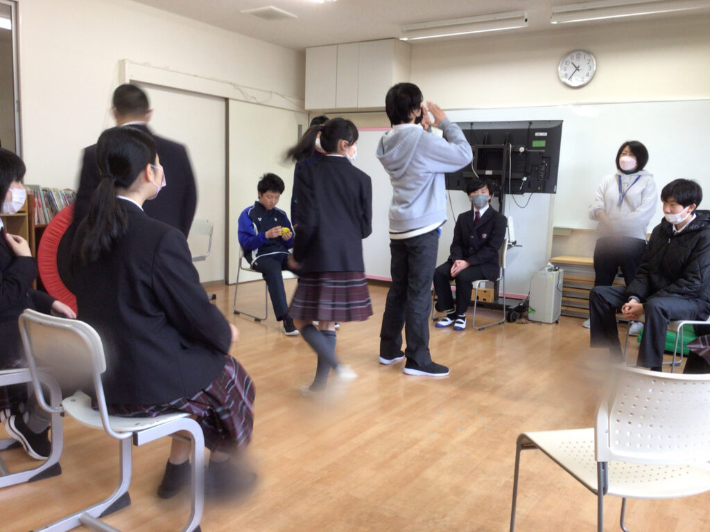 お互いに授業の中で楽しんでいる、引っ張り相撲と輪っか取りゲームをして遊びました。遊んだ後にハイタッチをしたり、最後まで勝ち残った友達と万歳をしたりして交流を深めました。