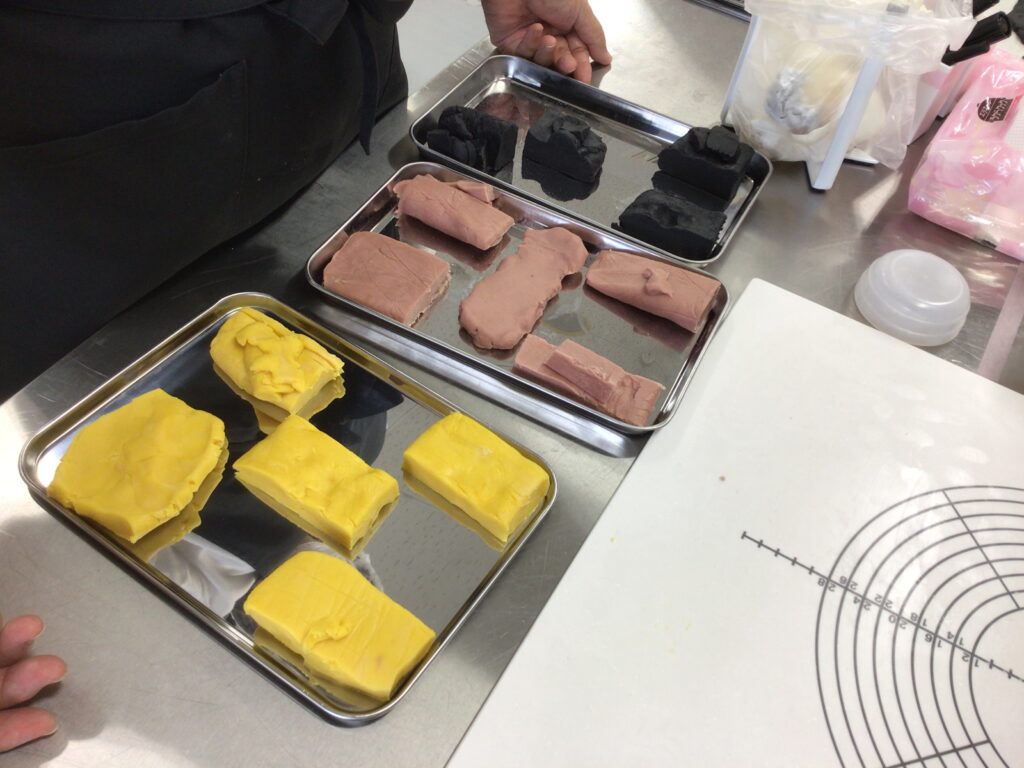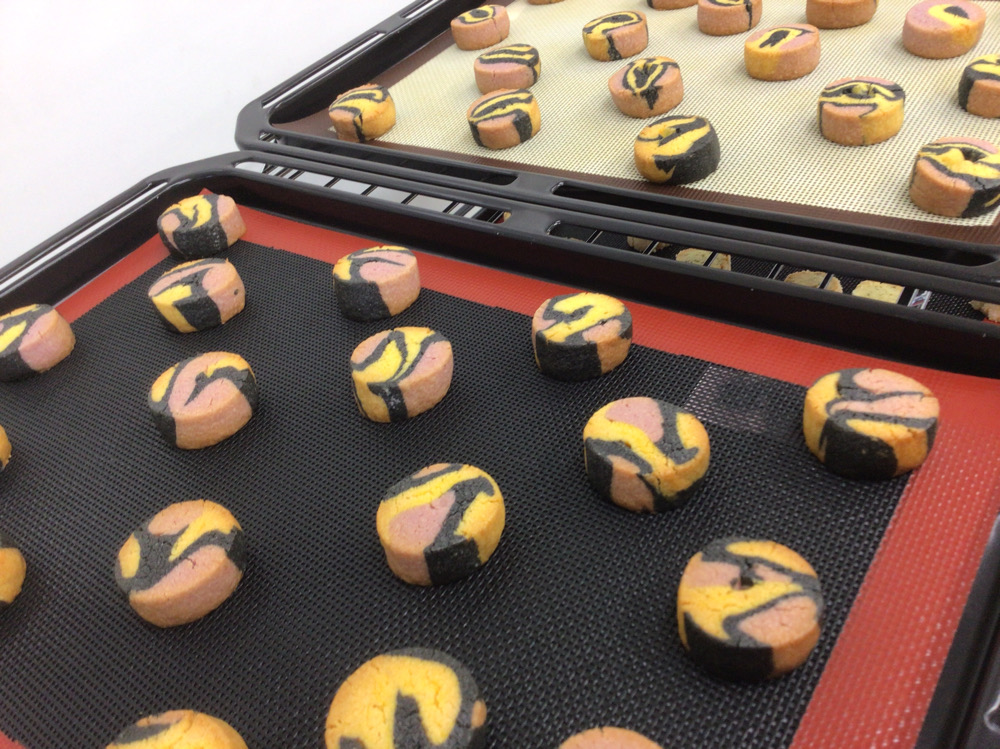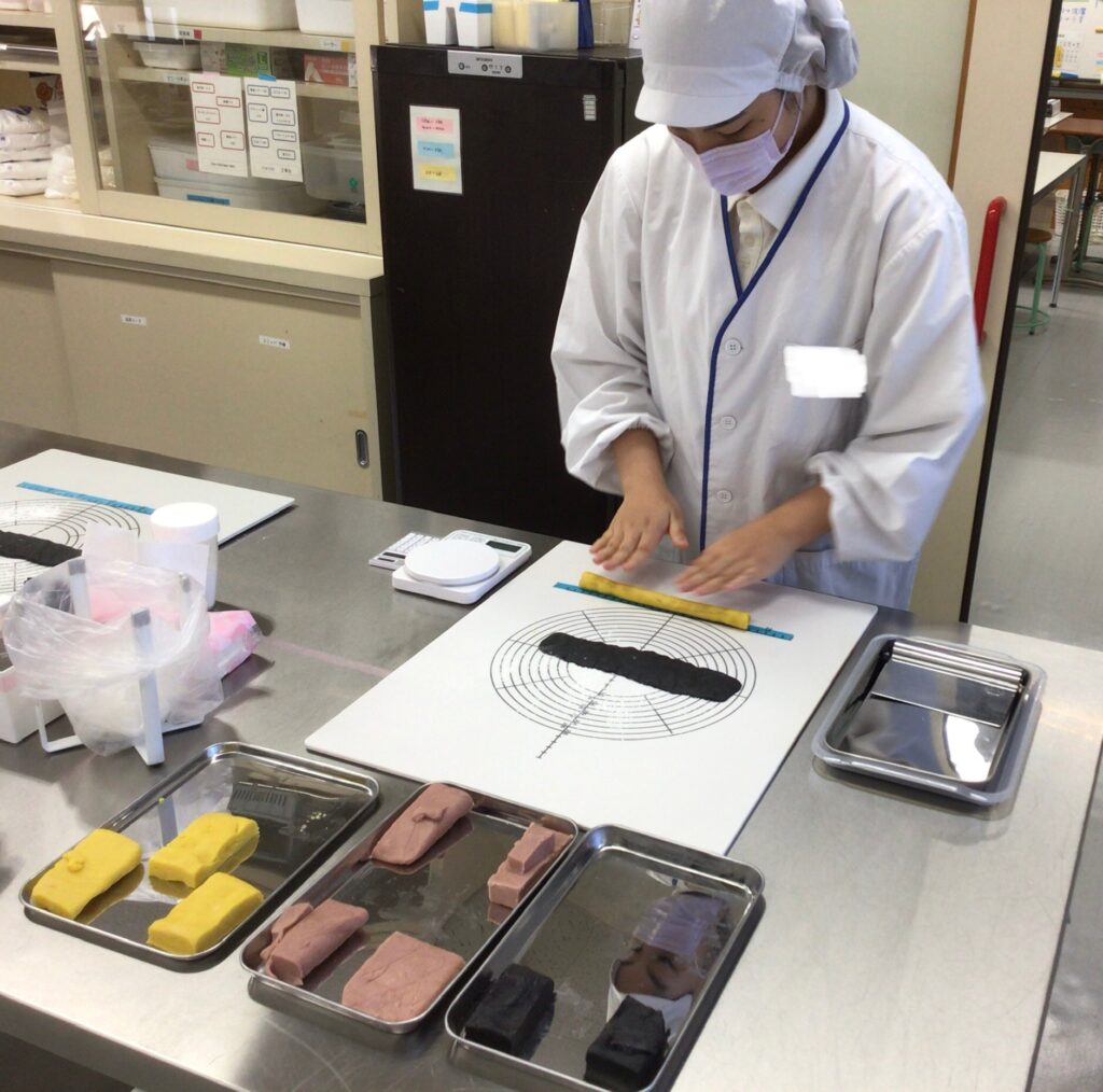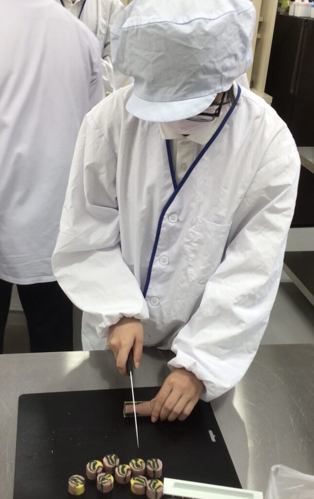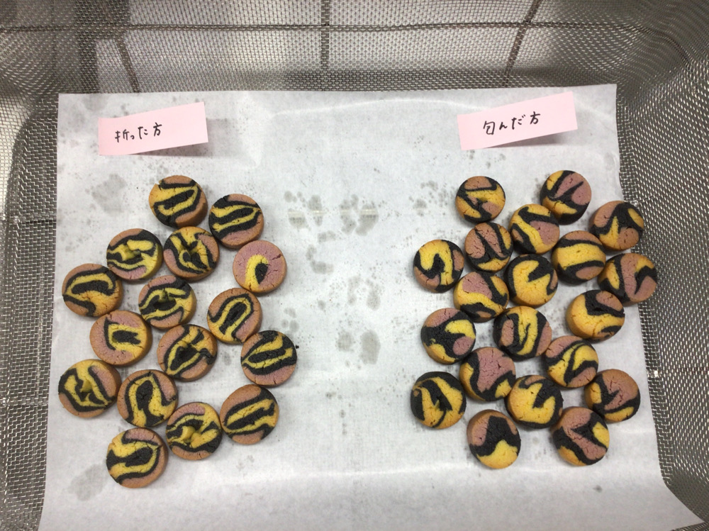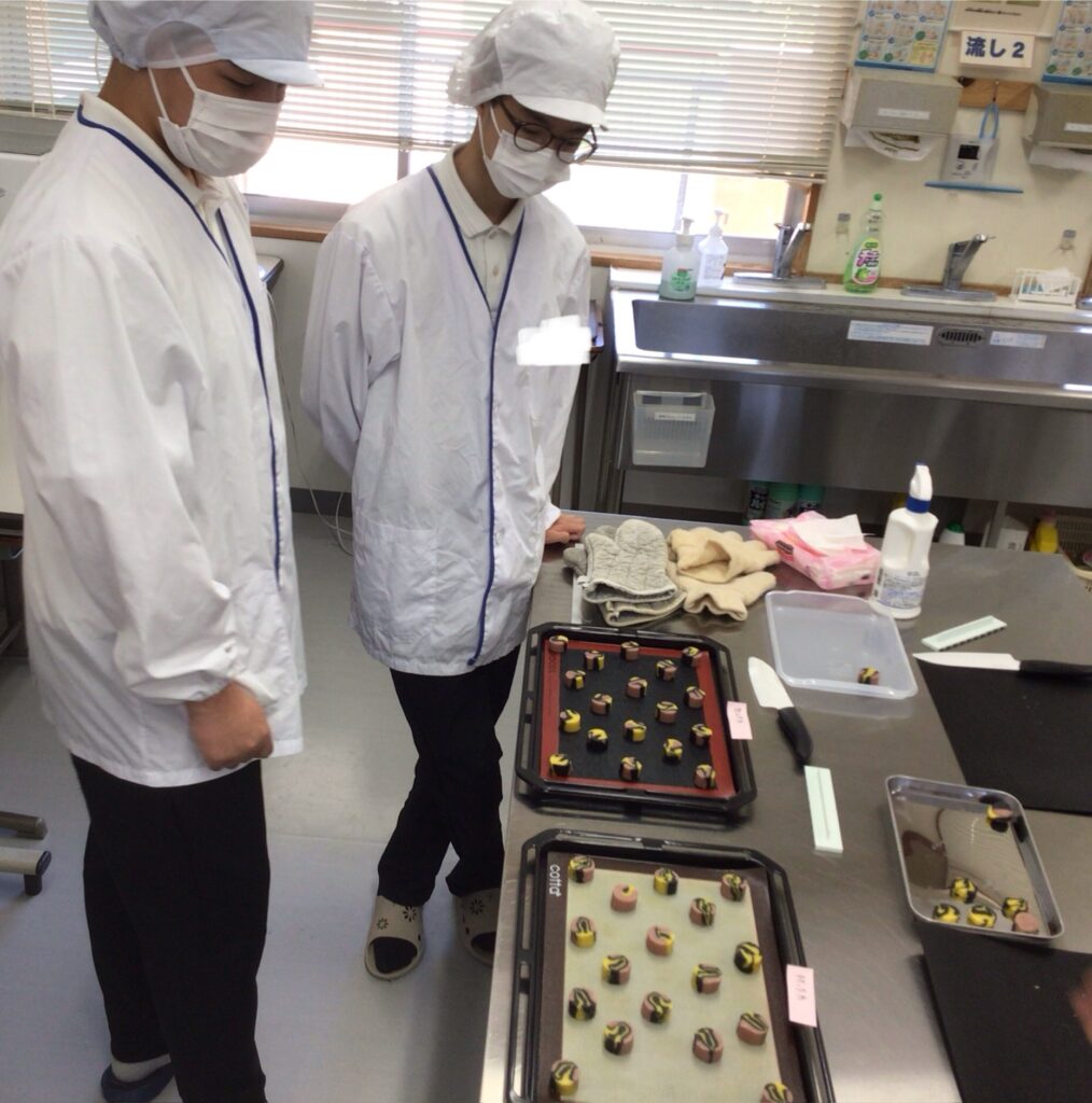 近隣の企業様から依頼を受け、B高製菓班では、ハロウィン仕様のディアマンクッキーを思考錯誤しながら作りました。3つのフレーバーを混ぜ合わせるのは初めての挑戦でした。3色の生地をどのように混ぜ合わせればきれいな模様が出るのか、どのフレーバーを合わせるとおいしく仕上がるのか等、相談しながら行いました。どのような模様が出るのか、ドキドキしながら棒状の生地を切りました。焼成後の模様を見比べ、イメージに合うクッキーを袋に詰め、納品することができました。自分達で考えたり、相談したりしながらイメージを膨らませ、依頼者の希望に合ったディアマンクッキーを作ることができ、達成感でいっぱいでした。