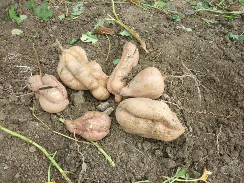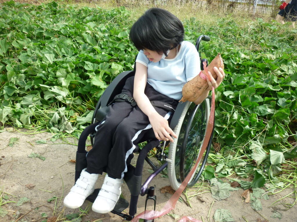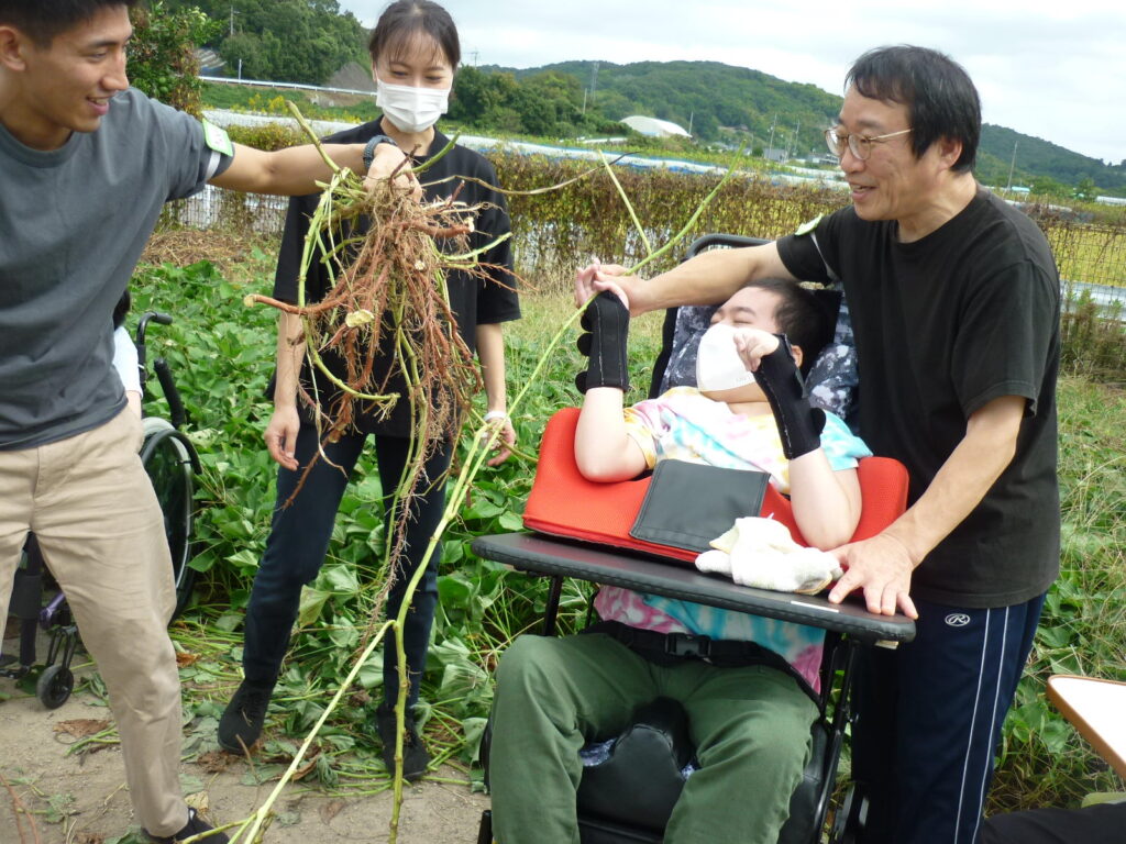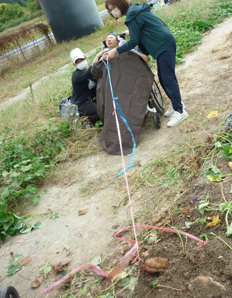 B中の畑に行き、いっしょに芋掘りをしました。「よいしょ。よいしょ。」芋に結んだひもを引っ張って、大きなサツマイモが収穫できました。B中の皆さんありがとう。