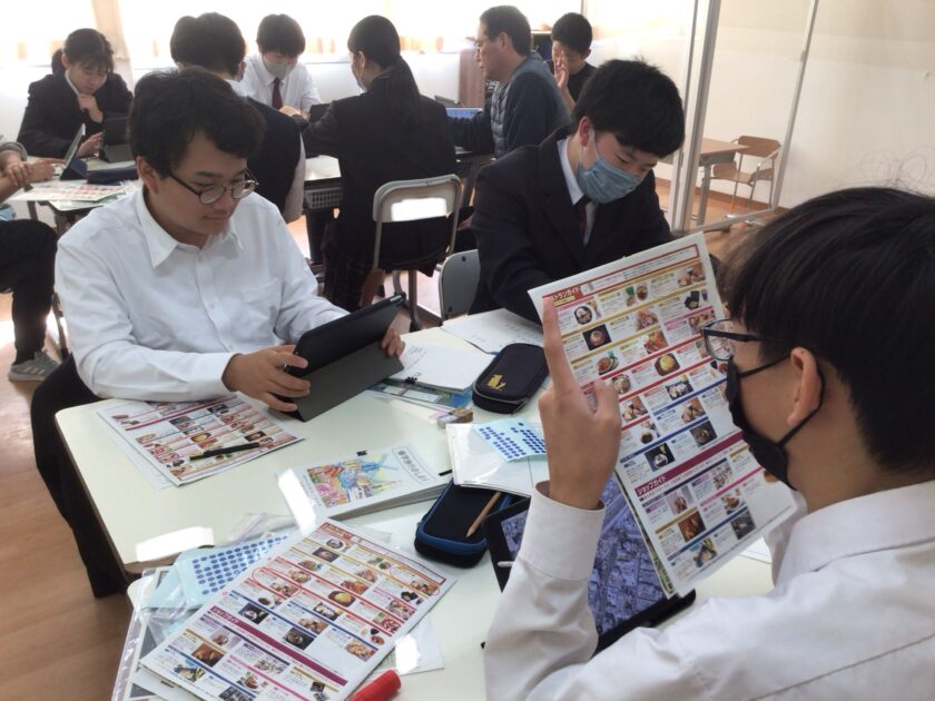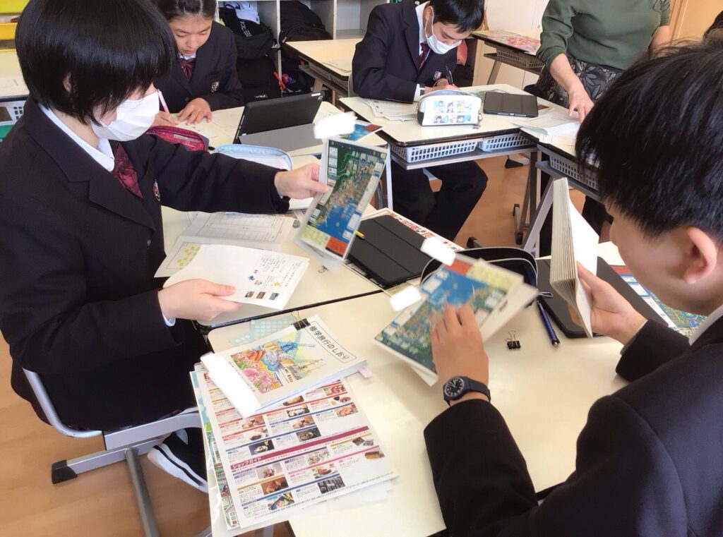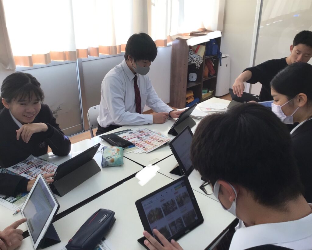 修学旅行の準備を進めています。グループ別自主活動では、タブレット端末を活用して、友達と協力して食事や活動計画を相談しています。「食事クーポンが使えるレストランはどこか。」「お土産はどこで買おうか。」「みんなが楽しめるアトラクションはどれか。」など、話し合いを通して、修学旅行をとても楽しみにしている様子が伝わってきました。