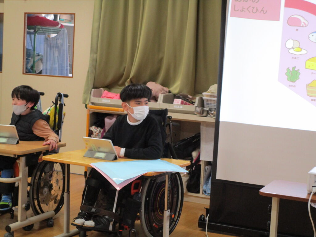 食事に含まれる栄養素について学んだことを発表しました。食べ物には、「体をつくる」「エネルギーになる」「体の調子を整える」といった働きがあることを知り、バランスよく食べることが大切だと再認識しました。また、給食ができるまでのビデオを見て、調理場では大きな道具を使うことを知り、栄養教諭や調理員さんへの感謝の気持ちを手紙で伝えました。