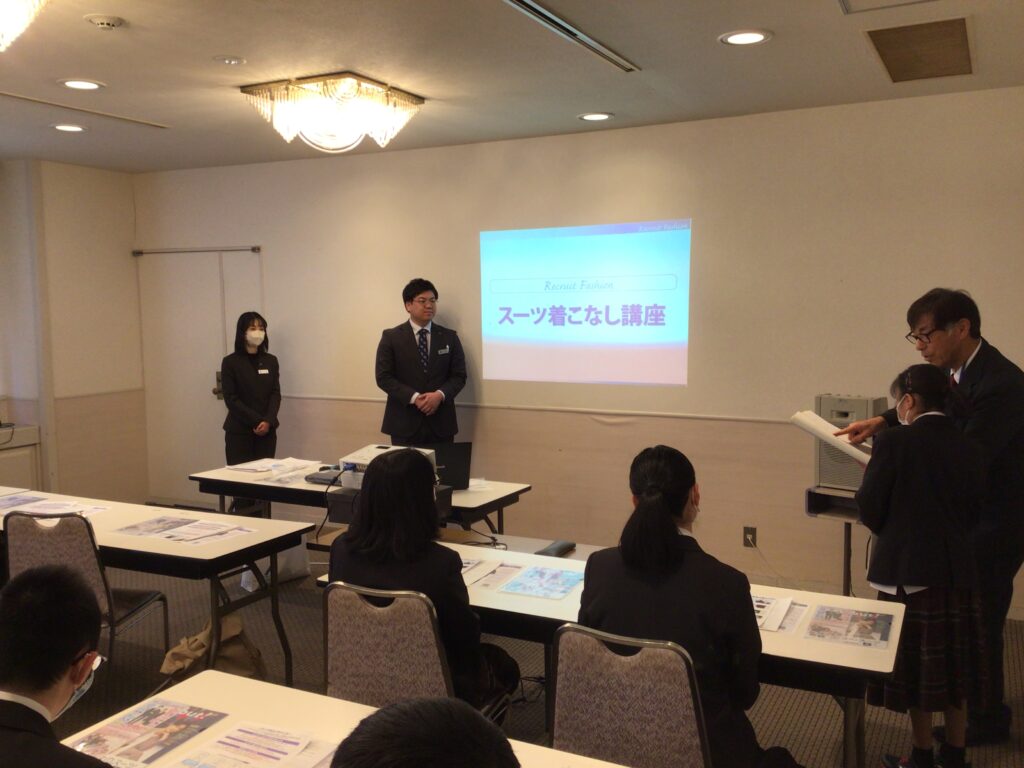 身だしなみ講座では、(株)洋服の青山から2名の講師が来てくださり、おしゃれと身だしなみの違いやスーツの着こなし方、ネクタイの締め方を教えていただきました。