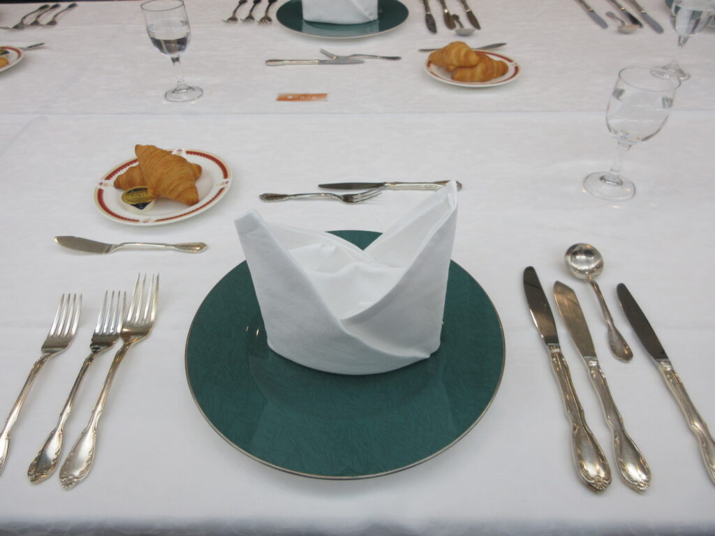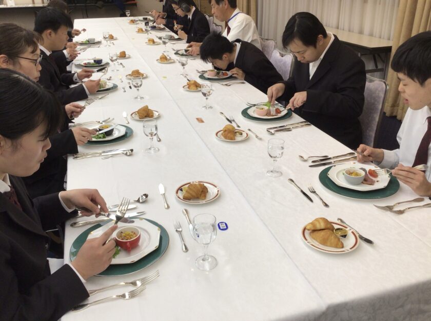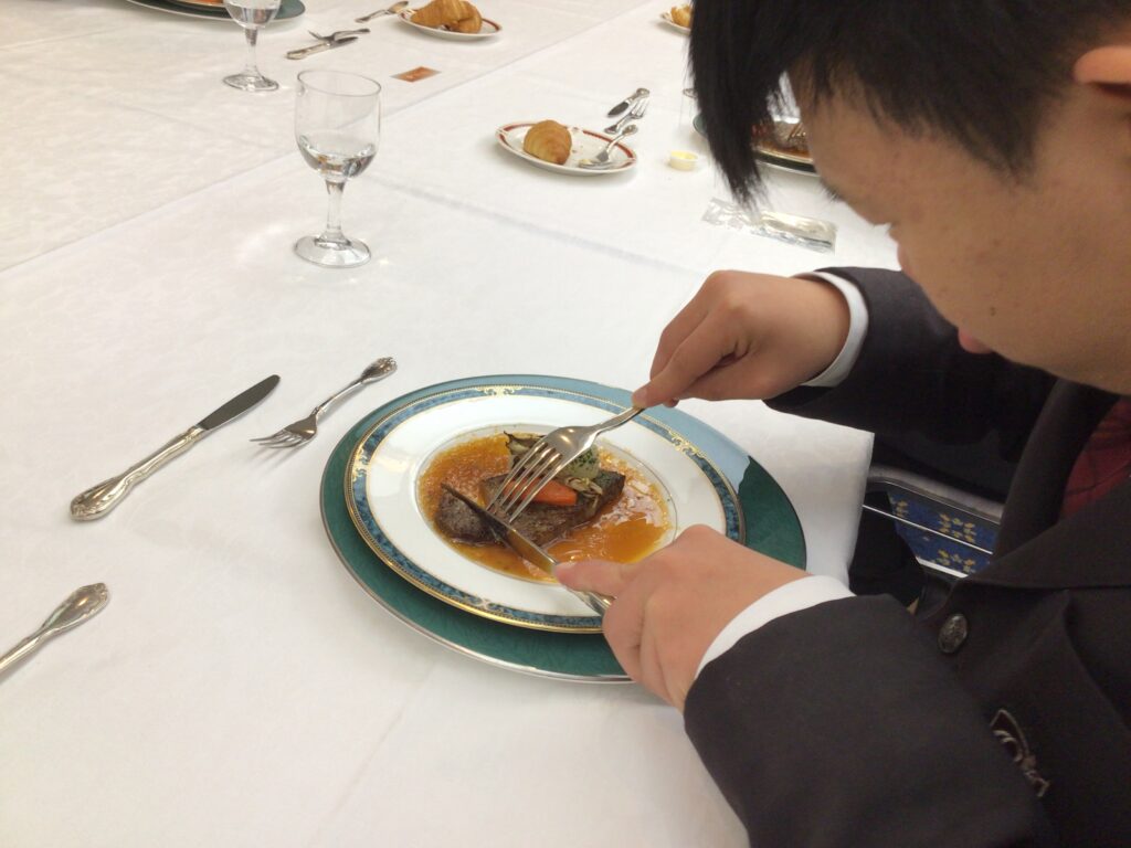 テーブルマナー講座では、ピュアリティまきびの方が講師としてコース料理を食べるときのマナーを教えていただきました。