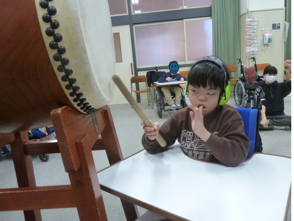 「うた・リズム」の学習では、11月半ばから「和太鼓」、「花笠音頭」に取り組んでいます。大きな和太鼓を力強く叩いたり、民謡の音色に合わせ花笠を持ったりかぶったりして楽しく練り歩いたりすることができました。