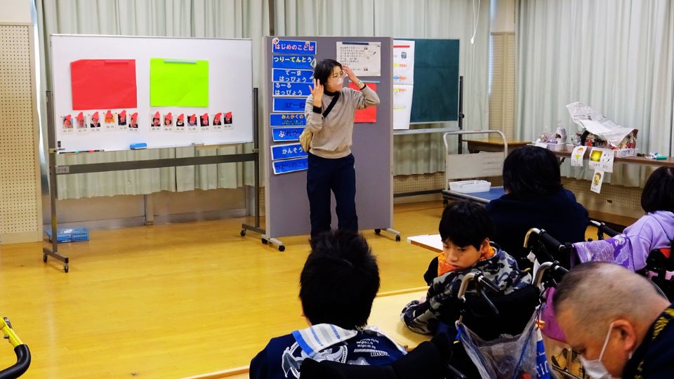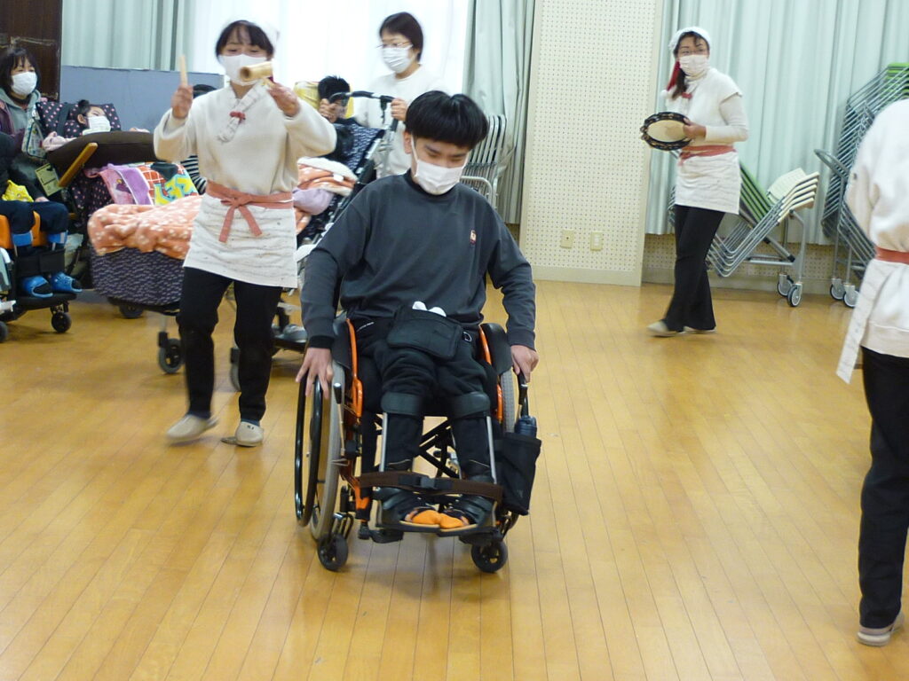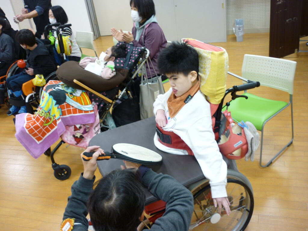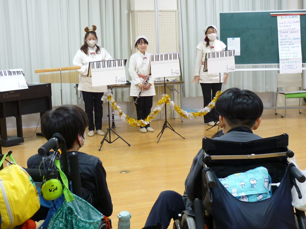音楽サークル「すまいる」さんを講師にお迎えして、音楽の授業をしました。一緒に合唱や合奏をしたり、演奏に合わせて速く動いたりゆっくり動いたりして、とても楽しい時間となりました。