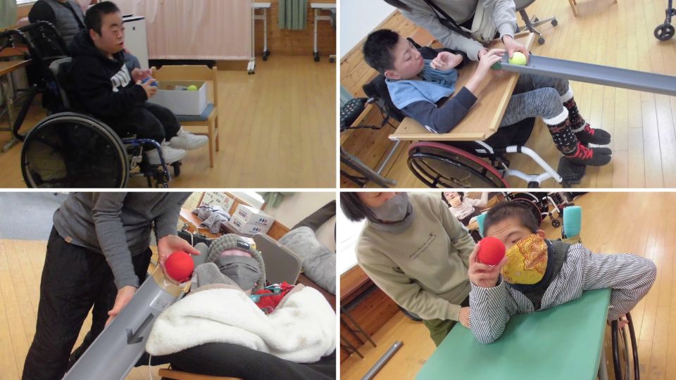 自分に合った投げ方や狙いの定め方を選んで、的に目がけてボールを転がしました。