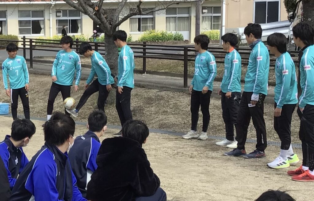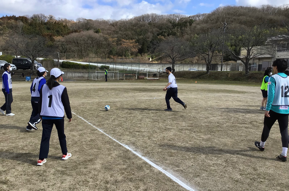 連携協定を結んでいる環太平洋大学サッカー部の大学生10名に来校いただき、高等部の体育科の授業でサッカーを行いました。自己紹介では、華麗なリフティングを披露していただき、生徒は目を輝かせながら声援を送りました。パス練習では、大学生の方からアドバイスをもらいながら、スローインやドリブルに取り組むことができました。ミニゲームでは、日頃以上に目を輝かせたり、張り切ったりしながら、大学生とともに楽しむことができました。