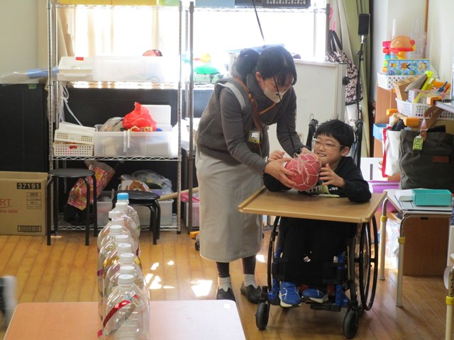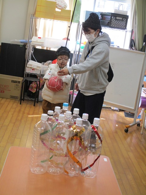 今年度最後の参観日は、親子で「びよんびよんボウリング」をしました。ピンの並べ方やボールを投げる位置を親子で相談したり、「3、2、1!」とボールを放すタイミングをカウントダウンをしたり、友達を応援したりと、大いに盛り上がりました。