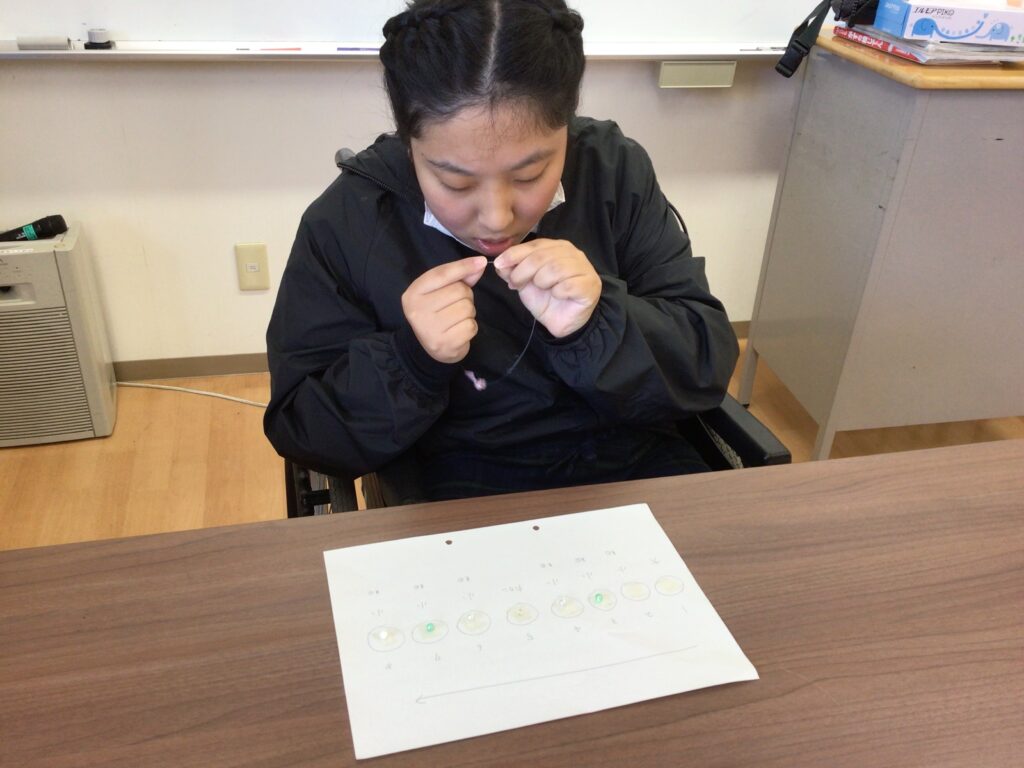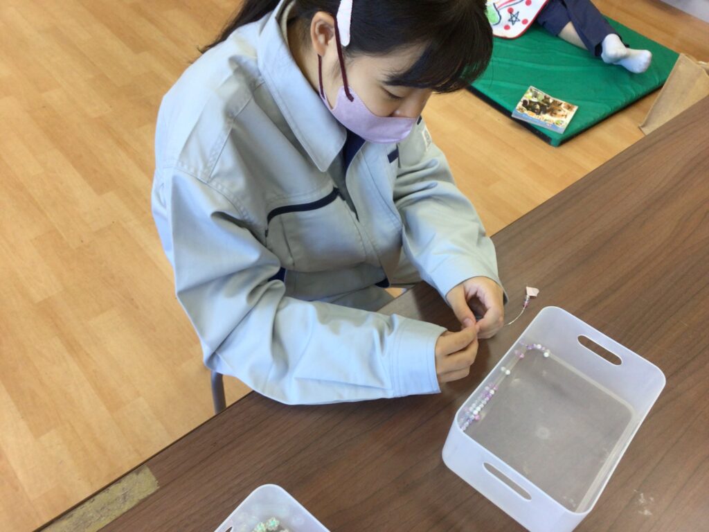 糸の色分けや糸を10本の束にする、ビーズ通しなどを生徒が分業して取り組んでいます。