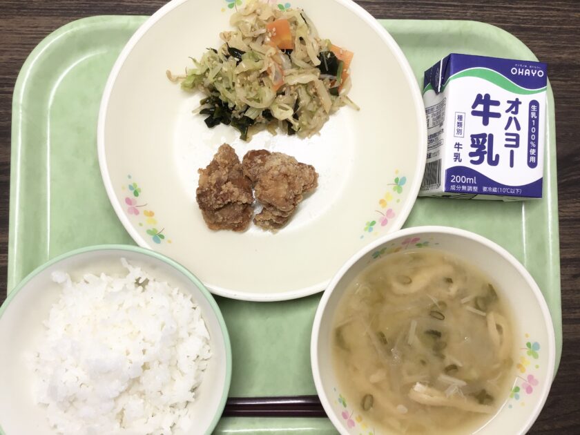 ごはん、牛乳、鶏肉の唐揚げ、レモン風味あえ、味噌汁