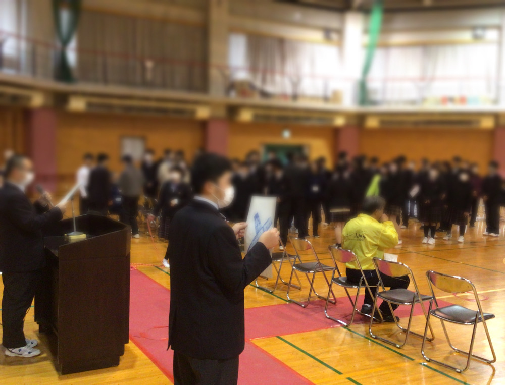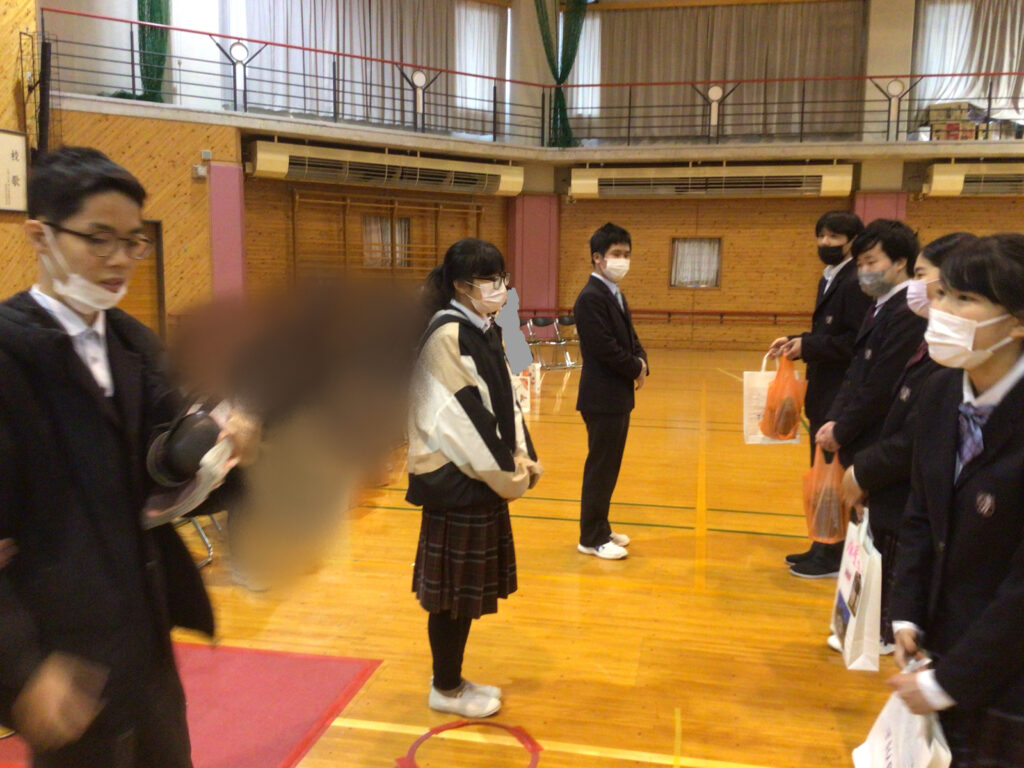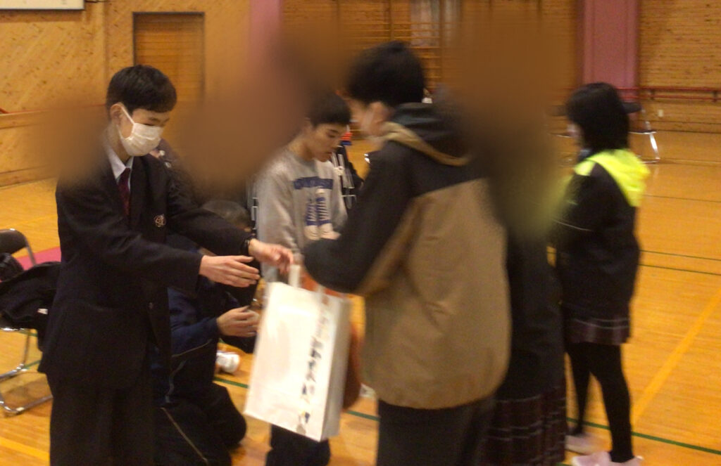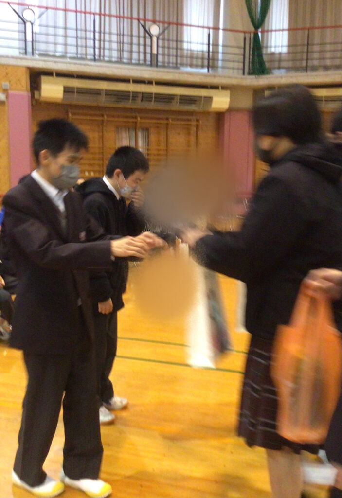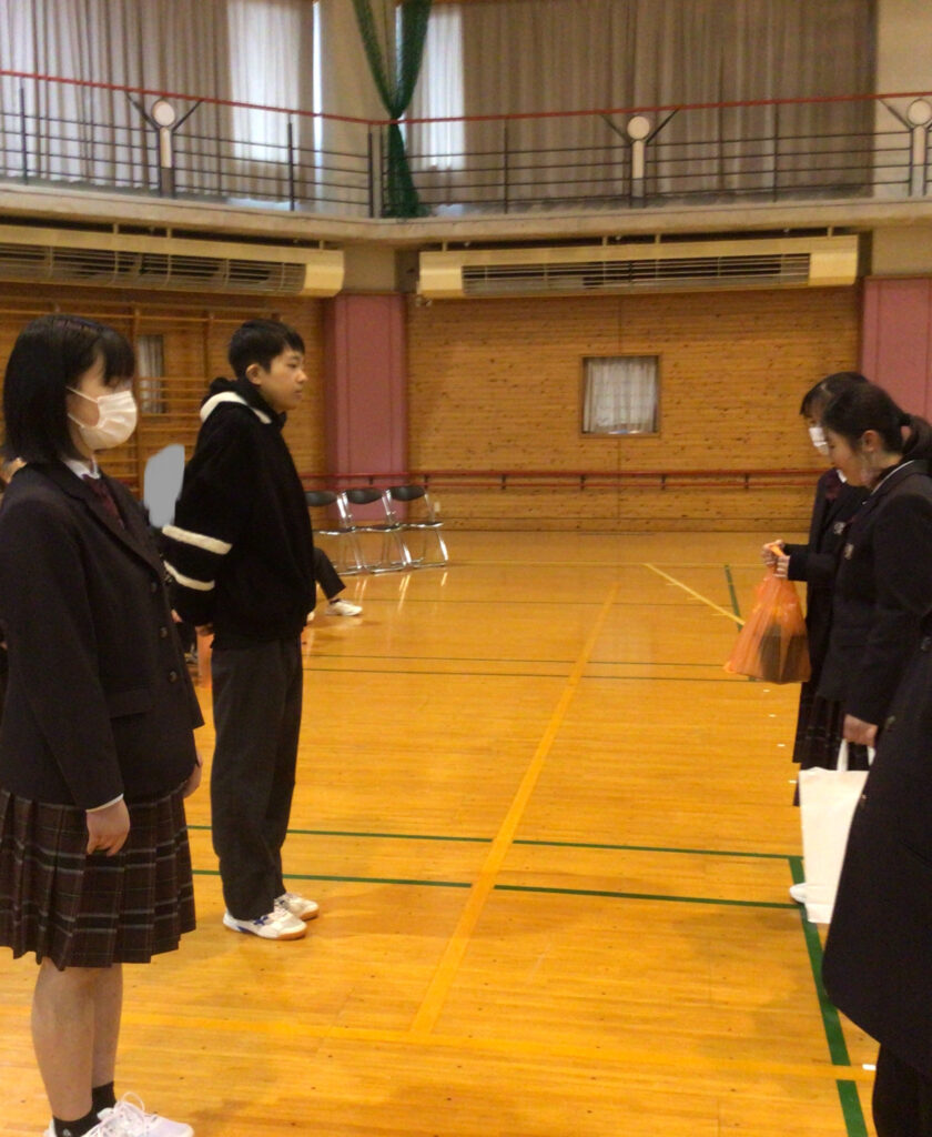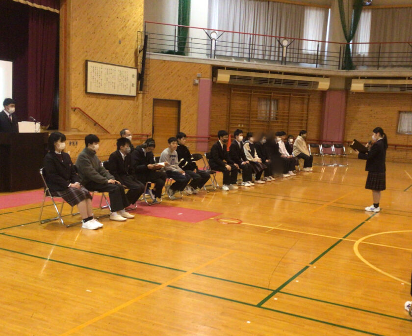 2月20日(金)、1、2年生が卒業する先輩方へ感謝の気持ちを伝えるために「3年生を送る会」を行いました。生徒会役員が考えた○×ゲームを一緒に楽しみ、全員合唱の「未来へ」を歌ったり、3年間の思い出を振り返るスライドを見たりして、体育館はとても温かな雰囲気に包まれました。1、2年生が作業学習で作ったクッキー、時計などのプレゼントや色紙を渡すと先輩方の表情もほころび、笑顔が溢れました。最後は卒業する先輩方から後輩達へ心温まるメッセージが贈られ、学年を越えた強い絆を感じるひとときとなりました。