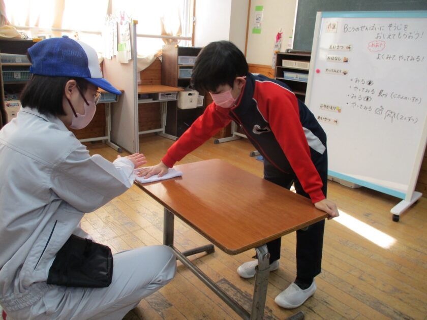 B小/B高/知的障害部門 B小学部・高等部 学部間交流 2026 年 3 月 5 日 by higasisien100 B小3年生がB高の先輩に、掃除の仕方を教えてもらいました。手本を見た後に、先輩たちから声を掛けてもらいながら活動しました。交流後の毎日の机ふきでも、教わった手順を意識する姿が見られています。