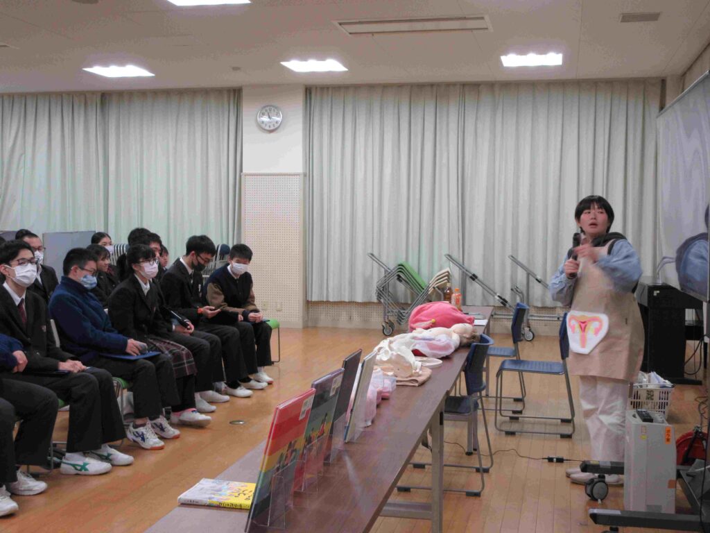 高等部の生徒を対象とした出前授業で、外部講師の先生をお迎えして「いのちのはじまりとあなたのいのち~自分を大切にするために~」というテーマのもと、生と性に関する学習を行いました。「いのちのはじまり」として、受精卵から始まっておなかの中で大切にされながら大きく育ち、今ここに自分の命があるということについて、目で見て触れて、話を聞いて、その神秘と奇跡に多くの生徒が心を動かされていました。大切な自分の命を一番大切にできるのは自分で、自分のことをもっと大好きになり、周りの人も大切にしていこうという気持ちが深まっていく心と命の学習になりました。