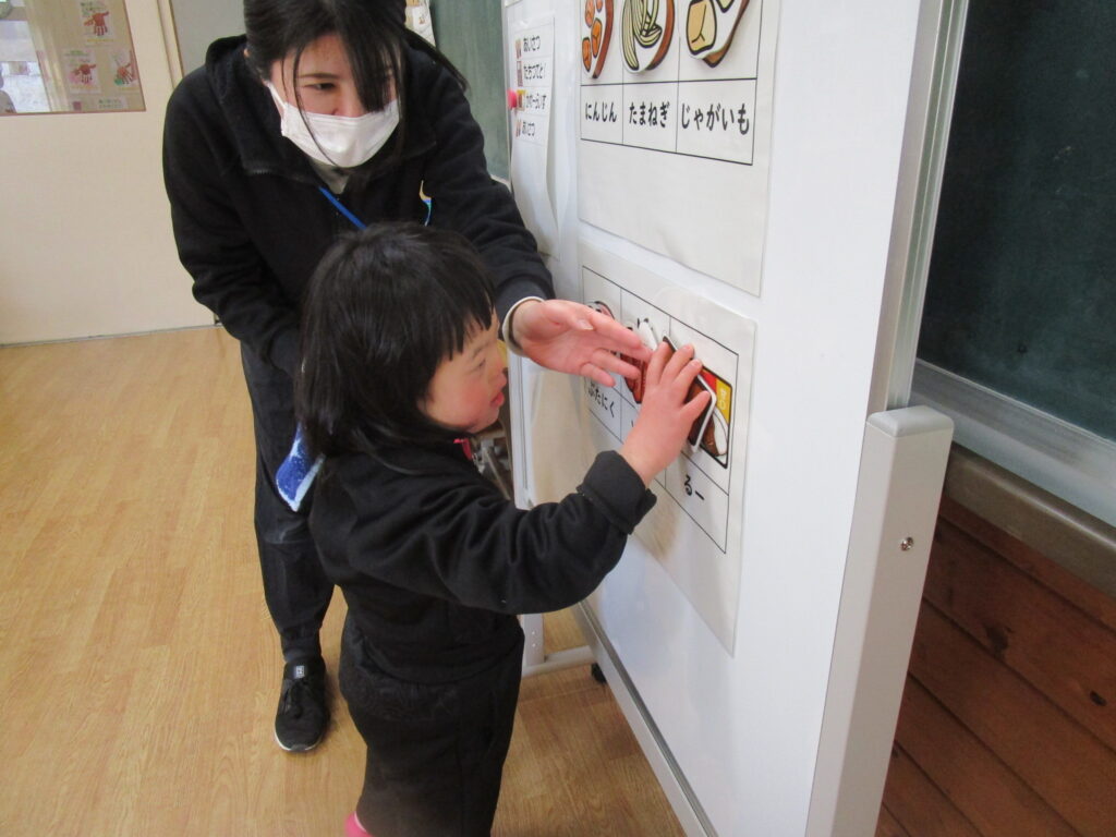 B小1年 ことば(国語)の授業では、「カレーライス」に取り組んでいます。カレーライスの歌を歌いながらパネルシアターでカレーの材料を確認したあと、具材のマッチングなどの活動をしています。好きな食べ物を題材にすることで意欲的に取り組むことができています。