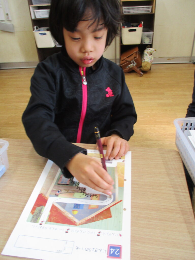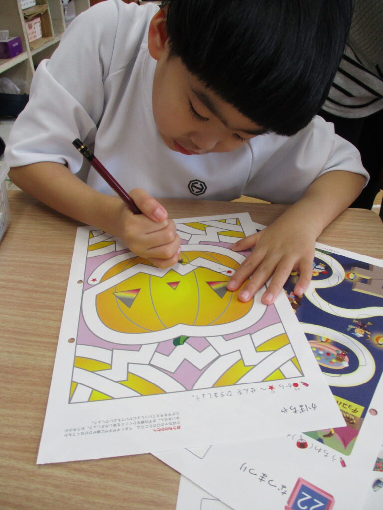 また、線つなぎにも取り組んでいます。真っ直ぐの線から始まり、今では迷路のような複雑な線つなぎまでできるようになった人もいます。