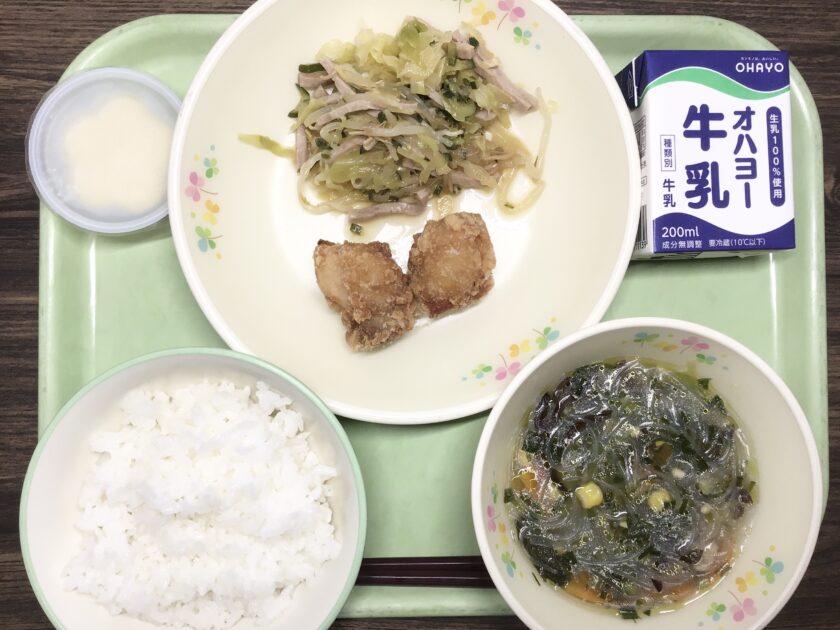 ご飯、牛乳、鶏肉の唐揚げ、中華サラダ、春雨スープ、豆乳プリン